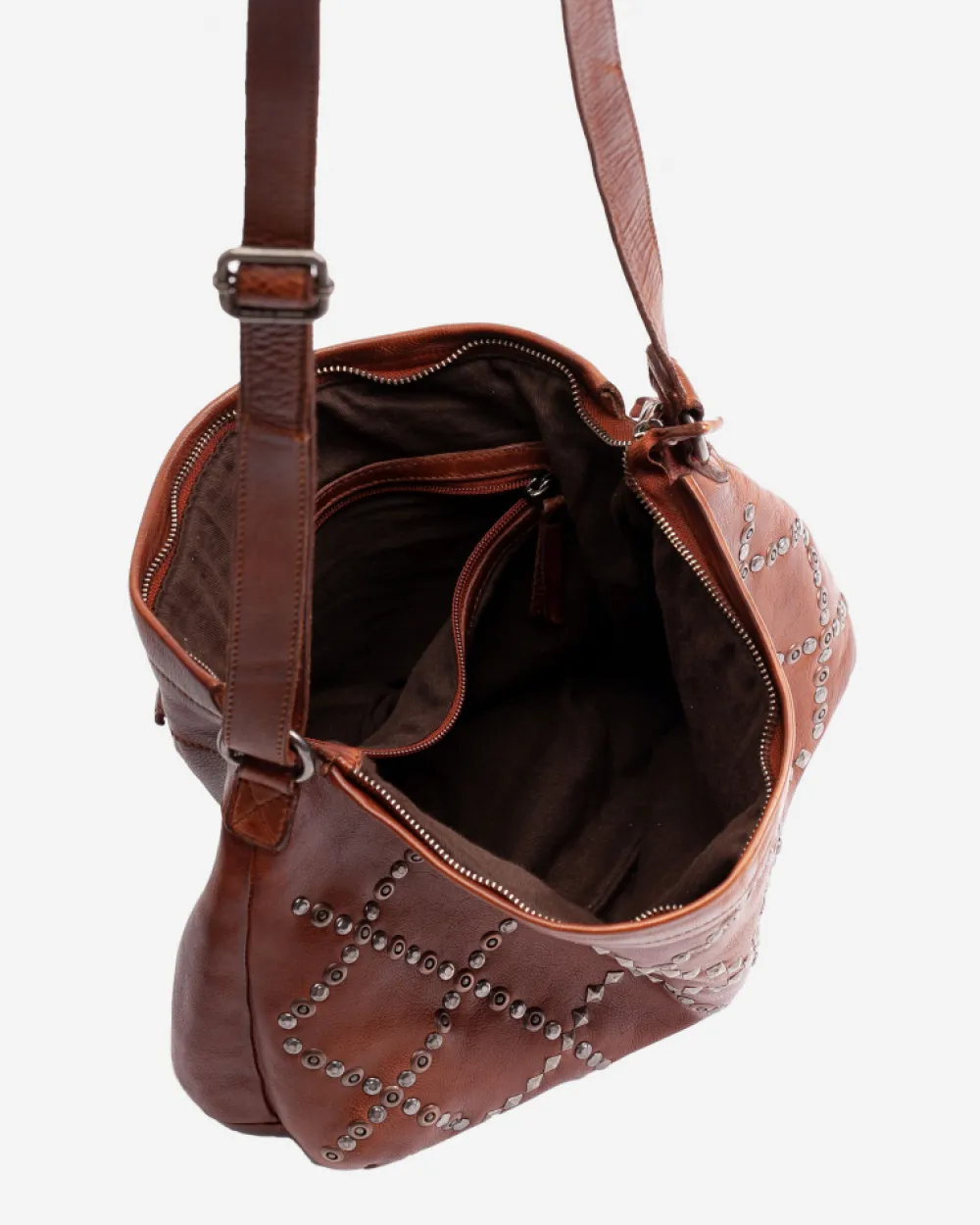 Bolso De Piel Natural Con Adorno De Diferentes Tipo De Tachuelas En La Parte Frontal. Bandolera Regulable. Bolsillo Con Cremallera En El Dorso. Forro En Algodon. Bolsillo Con Cremallera En El Interior. Cierre Con Cremallera. Referencia: Lak1L