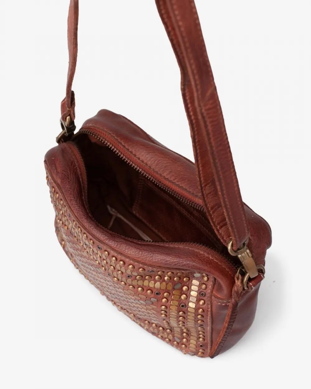 Cross Bag Pequeno De Piel Vacuna, Lavada, Y De Curticion Vegetal. Tachas Metalicas En La Parte Frontal, Cierre Con Cremallera, Asa De Hombro Extraible, Bandolera Ajustable Y Extraible, Bolsillos Internos, Y Forro De Algodon. Referencia: Lot1L