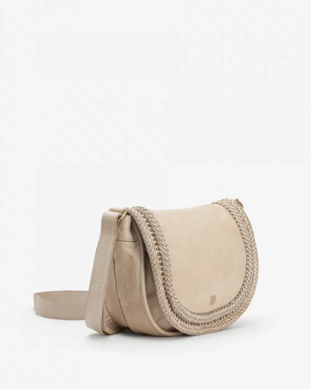 Bandolera Mediana De Piel Natural Y Curticion Vegetal. Solapa Con Tachas Redondas Y Piel Trenzada A Mano. Cierre Con Boton. Compartimiento Principal Con Cremallera, Y Bolsillo Trasero Con Cremallera. Referencia: Wik1L