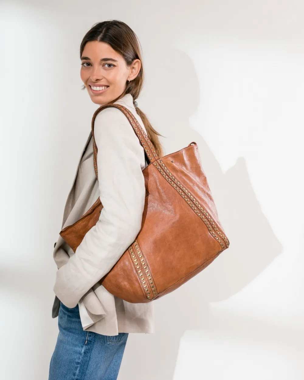 Bolso Shopping En Piel Natural Y De Curticion Vegetal. Adornos En Tachas Doradas. Cierre Con Botones A Presi N Y De Magneto, Y Mosquet N Y Aro En Los Laterales Para Modificar La Forma Del Bolso. Bolsillo Con Cremallera En La Parte Superior De F Cil Acceso. Referencia: Shr1L
