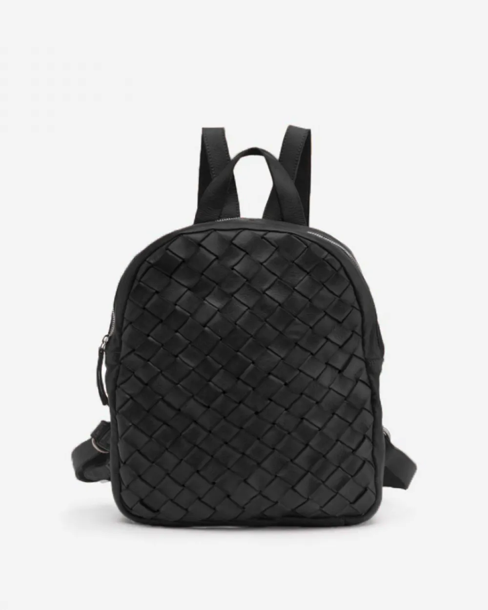 Mochilla De Piel Natural Trenzada A Mano En La Parte Frontal. Asas Para Llevarla En La Espalda Y Asa De Mano. Bolsillo Con Cremallera En El Dorso. Forro En Algodon. Multiples Bolsillos En En Interior. Cierre Con Cremallera. Referencia: Lei6L